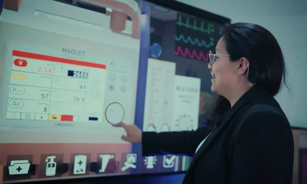 - Interacción táctil real con el simulador. “Lo que me gusta de la pantalla es que puede interactuar con el simulador… la gente tiene una interacción más inmersiva”, explica Jennifer. Al tocar la pantalla, los asistentes “juegan” con el caso clínico sin intermediarios.