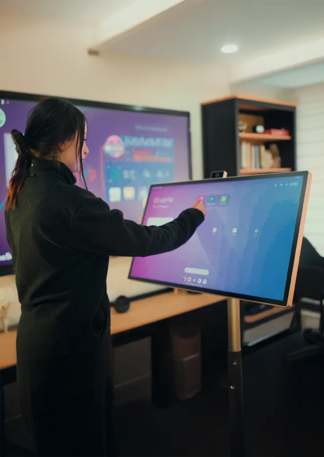 Wandr es una pantalla táctil portátil 4K de 32″ con Android, batería y ruedas. Funciona como hub interactivo móvil para educación, reuniones o entretenimiento: gira, se inclina y ajusta en altura en segundos, sin cables ni instalaciones.